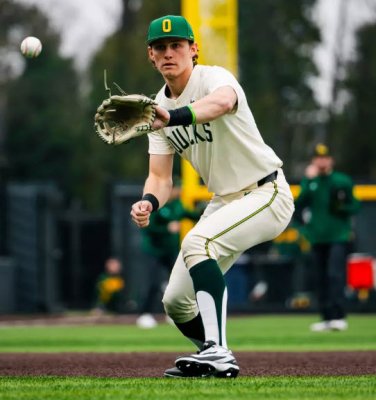 5-0 Ducks after one inning. Ryan Featherston got his first start at Oregon, and put them down in order. He has a 90-92 mph fastball, but a nasty curve/drop-ball that creates soft contact and grounders. Then he has a changeup to boot! Ryan Cooney got plinked, and moved to second on a balk. Jax Gimenez walked, and then Dominic Hellman just put the barrel out there and got a hit with two strikes into the shallow right field. He is beginning to improvise to help the Ducks, and get on base when his favorite pitches aren't available. Gabe Miranda got walked and brought in the first run with the bases being loaded, and then Maddox Molony rips a shot down the 3rd baseline to get a double and score two! Drew Smith grounds out at first, but scores Miranda, and then Angel Laya grounds out to score Molony. Wow, what a first inning and it comes from pitching gifts again. Great to see it happens to other schools too, although this pitcher has not pitched in three years due to recovery from Tommy John surgery. Yep...he was rusty.