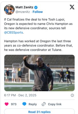 15. A few things have me feeling pretty good. In the post I saw about Stein taking the Kentucky job it also said he would continue his duties with the team until the season ends. He probably has an arrangement similar to what Lanning had with Smart at Georgia, where he wasn't allowed to recruit for the team anymore but could begin to recruit for his new team. What makes things more difficult for Stein is that I don't think he is officially hired at Kentucky yet and TODAY is National Signing Day so who knows the recruiting class he even has to work with at the moment... well I guess I can look it up.... ranked 58th with 15 recruits basically all three stars on Rivals and I can't tell who has actually signed at this point anyways. The reality is that Stein is going to have to recruit who he can before the second signing period and dive into the transfer portal. The portal doesn't open until January and I wouldn't be surprised if he takes the lion's share of Ducks who transfer. His first season is going to be a bit rough but the reality is that with the NSD being so early now that new coaches are barely hired before they have to sign a recruiting class so they'll be portal heavy. The same goes for Lupoi and Cal. Though in the case of Lupoi I haven't seen anything saying that he intends on finishing the year at Oregon or not. However, Hampton has called plays on defense before and Lanning is the HC so I am a little less concerned on that front.