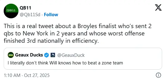 17. He won't be a WOW hire, but 42-year-old Wake Forest head coach Jake Dickert has the Demon Deacons 5-2 with Saturday's upset defeat of SMU. He's doing this with the smallest student body, stadium, and the smallest football budget in the ACC. Dickert is 42 with 17 years of coaching experience, including at Washington State, another low-budget program, where he had the Cougars, with now Oklahoma QB John Mateer and OC Ben Arbuckle, playing competitive football. He helped move Mateer and Arbuckle into a higher tax bracket. Hw won't be offered the top-tier jobs, but he'd make sense at VA Tech or at Stanford.