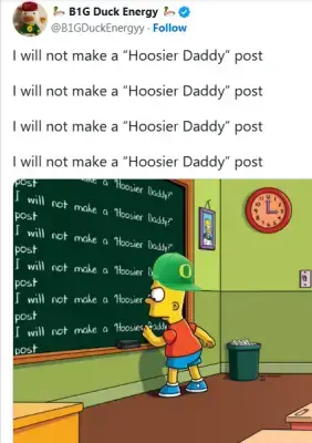 Thanks, Darren. Always a treat! 247 Sports combined roster rankings: OBD No. 5, Hoosiers No. 72. Oregon has a significant roster and home-field advantage. You can bet, as we saw in the movie 'Hoosiers', Curt Cignetti will focus on the David vs. Goliath theme. The Hoosiers survived a letdown rock fight game at Iowa to climb to No. 7 in the AP. Under Cignetti, Indiana has come to life. Cig took over the 'losingest' team in CFB, and in 2024, Indiana's 11 wins set the Indiana record. Football season tickets are sold out for the first time in ... forever. The man's two losses at Indiana to date were road games against the final AP No. 1 Ohio State and No. 2 Notre Dame. Saturday will give Indiana the chance to break its 0-46 road record against top-five-ranked teams. Indiana did win its last game played against Oregon; Oregon's 24 to 30 loss to Indiana in 2024 was authored by Indiana coach Gerry DiNardo. Today, DiNardo, an AA guard and national champ winner at Notre Dame, is one of the Big Ten Network's lead football analysts. During the Brooks and Bellotti years, compared to the Hoosiers, OBD was Vince Lombardi's Green Bay Packers. The Arches aren't Golden in Austin, for sure, but for decades, the Indiana football Hoosiers put the S in HoSers and Suck. 🤬 FWIW, the last 2025 NFL draft I saw on Athlon has Dante at No. 1, Moore better than Fernando Mendoza at No. 3. The QB play in the SEC this season was predicted to be the best, but this game could feature the best QB duel of the regular season. James Franklin and his coaching staff belong in the State Pen and not at Penn State. The PSU coaches, especially on special teams and defense, were schooled by interim Bruins head coach Tim Skipper and first-time play caller Jerry Neuheisel, who allowed Nico to play with athletic abandon. PSU tanking does matter, possibly a lot. First, a 9-3, or 8-4 Penn State, hurts the seeding of every B1G playoff team. Second, Penn State not qualifying for the playoff means a loss of multi-millions for the conference. Third, depending on Saturday's results, especially Indiana at OBD, Ohio State at Illinois, Michigan at USC, and Nebraska at Maryland, the conference could be at risk of having only two teams finish 10-2 or better in the regular season. (Perhaps in error, I'm giving UW the Friday night home win against OBD's Week 8 opponent, Rutgers.) Darren, thanks again for another enjoyable read. Hose Down the Hoosiers!
