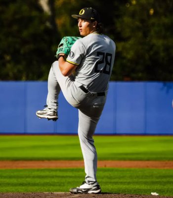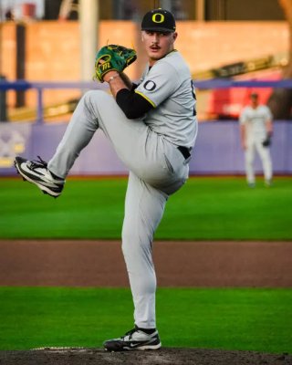 OREGON ATHLETIC COMMUNICATIONS FOR IMMEDIATE RELEASE | FRIDAY, MARCH 27, 2026 BASEBALL | @OregonBaseball Ducks Blank Gauchos to Take Series Opener GOLITA, Calif. — After six scoreless innings, No. 20 Oregon was finally able to break through for four runs over the final three innings to claim a 4-0 nonconference win over UC Santa Barbara in game one of the series on Friday night at Caesar Uyesaka Stadium. In a matchup between two of the top starting pitchers in college baseball, both teams threatened into the middle innings but neither team could come through with a big hit to push a run across the plate. Oregon (22-4) ran up UCSB starter Jackson Flora’s pitch count in innings two through four, forcing the No. 2 starter in the country according to D1Baseball to throw more than 20 pitches in each of those innings. Despite the high pitch count, the Ducks stranded six runners in the first four innings including three in scoring position. UCSB (15-8) had similar frustrations against Oregon starter Will Sanford, the No. 19 starting pitcher on D1Baseball’s list. The Gauchos (15-8) stranded 10 runners in five innings against Sanford, including leaving the bases loaded in both the third and fourth innings. Will Sanford at UCSB Neither Sanford nor Flora factored in the decision with both leaving the game after five innings without allowing a run. Sanford gave up two hits with five walks and four strikeouts. Flora also allowed two hits with three walks and five strikeouts. Oregon’s bullpen ended up besting the UCSB bullpen leading to the Ducks’ win. Luke Morgan (1-0) picked up his first career win, tossing two scoreless innings. Tanner Bradley and Devin Bell also chipped in a scoreless frame. The Ducks’ scored four runs against the Gauchos bullpen. How It Happened: Scoreless heading into the seventh inning, Jack Brooks changed that with one swing of the bat with one out in the seventh. Brooks crushed the first pitch he saw 443-feet with a 110 mile per hour exit velocity over the towering scoreboard beyond the right-field fence. The Ducks tacked on three insurance runs in the top of the ninth, sparked by a Gabe Miranda leadoff bunt single. Brooks moved Miranda to second with a sacrifice bunt before Ryan Cooney reached on an infield single moving Miranda to third. After fouling off a squeeze bunt attempt, Jax Gimenez ripped a line drive double over right-fielders Max Staggs’ head to score Miranda and move Cooney to third. A New Star Reliever? Luke Morgan gave Oregon two scoreless innings. Cooney scored on a balk when Stunner Gonzalez tripped while starting to deliver a pitch for a 3-0 lead. After a Drew Smith intentional walk, the Ducks stole a run when Smith intentionally got caught in a rundown long enough for Gimenez to score from third to make it a four-run game. Box Score Notes: The shutout was Oregon’s fifth of the season, including the Ducks’ second on the road trip … Gimenez extended his hitting streak to 13 games, matching the 10th longest in Oregon’s modern-era history … The two teams combined to leave 22 runners on base (UCSB 13, Oregon 9) … They combined to go 3-for-24 with runners in scoring position with only one of those hits scoring a run, while going 1-for-21 combined with two outs. On Deck: Oregon and UCSB play game two of the series on Saturday with a 3:05 p.m. first pitch (ESPN+).