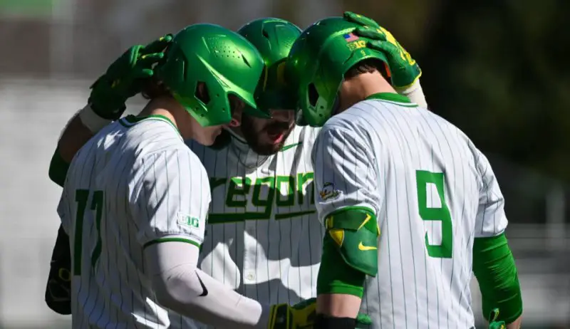 2. OREGON ATHLETIC COMMUNICATIONS FOR IMMEDIATE RELEASE | SATURDAY, FEBRUARY 21, 2026 BASEBALL | @OregonBaseball Ducks Clinch Series With Another Shutout EUGENE, Ore. – The Oregon baseball team remained undefeated and secured a series win over Youngstown State on Saturday afternoon with a 7-0 victory in game three of the four-game series at PK Park. The Ducks (7-0) recorded their second shutout in as many games, following a 3-0 win on Friday. Oregon got six scoreless innings from starting pitcher Collin Clarke (2-0), who was backed by an offense that put up five runs in the first three innings and scored in four of the first five frames. "Collin has pitched well so far this season, and he pitched well again today," head coach Mark Wasikowski said. "He mixes them up and locates his fastball really well. When he's doing that, he has been really effective so far this season." Seven different Ducks checked in with a base hit, and both Gabe Miranda and Burke-Lee Mabeus slugged their first home runs of the season. Miles Gosztola relieved Clarke and fired two scoreless innings before giving way to Leo Uelmen to close it out in the ninth. Oregon will try to complete its second straight four-game sweep to open the season on Sunday afternoon. "It's hard to win four games in a row against anybody," Wasikowski said. "We have to be ready to play. That's one of the things we focus on in our postgame talk and just getting our minds right. I think if they do the same thing and are aggressive on the mound, they'll be fine tomorrow." How it Happened: Oregon got on the board early against Youngstown State starter Jack Messmore (0-1), who loaded the bases in the first inning with two walks and a hit batter. Drew Smith came through with a clutch two-out hit for the Ducks, ripping a two-run single through the left side for a 2-0 lead. The Ducks used the long ball to add to their lead in the third, starting with a solo shot to right field off the bat of Miranda. Maddox Molony followed with a double, and Mabeus ripped a two-run shot to right field to extend Oregon's lead to 5-0. A Home-Run Huddle Miranda and Mabeus became the eighth and nine Ducks to hit home runs through the first seven games of the season. "They are good players," Wasikowski said. "I know we lost a lot of home runs from last year, but we take a lot of pride in being in the weight room. We feel like that is one of the staples of our program." Oregon took advantage of more free passes in the fourth inning, adding a run on a bases-loaded sacrifice fly by Molony. In the fifth, a pair of singles gave the Ducks runners on the corners with one out, and Jax Gimenez executed a perfect sacrifice bunt to make it 7-0. That was all the offense Clarke would need as he struck out six batters and gave up just two hits and a walk across six shutout frames. It was the second straight scoreless outing by an Oregon starter, after Will Sanford kept Youngstown State (0-6) scoreless over six innings of his own on Friday. Clarke worked around singles in each of the first two innings before facing the minimum in each of his final four frames, and he was helped in the first inning by a terrific leaping catch at the wall in right field by freshman Angel Laya. The Ducks also erased a leadoff walk in the fourth inning on a slick double play that started with a diving stop by Molony at shortstop. "Our defense is amazing," Clarke said. "I have full confidence in the world knowing that the guys behind me are going all out." Gosztola came on in the seventh and struck out the first two batters he faced before walking the next two, but he escaped the inning with a groundout. He then struck out two more in a 1-2-3 eighth inning, and Uelmen erased a one-out walk in the ninth with a double play to end the game. Collin Clarke Box Score Notes: Ryan Cooney and Gimenez each had two hits, and both Smith and Mabeus drove in a pair of runs … The Ducks worked eight walks, including two each by Molony and Dominic Hellman, and struck out just three times … Oregon has now held Youngstown State to just one run on eight hits with 29 strikeouts through 27 innings in the series … The Ducks recorded back-to-back shutouts for the first time since March 2-4, 2025. On Deck: The Ducks will go for a four-game sweep of Youngstown State on Sunday. First pitch is set for 12:05 p.m. at PK Park. Quotable: RHP Collin Clarke On his go-to pitch to get back in the zone... "Today it was the change-up, normally I try and throw all pitches in the zone, but today it was the change-up. There wasn't really anything different today, last week I was in the zone with it too." On what he's learned so far from this series and how he will prepare for the next... "Prepare the right way. Go home, watch film, and keep going about the process the right way." 1B Gabe Miranda On the depth and power Oregon's hitting has... "It's awesome. I know that one through nine are going to have competitive at bats. And it's good knowing that the guy behind me is going to get the job done, whether it's with power or not." On his mindset at the plate today... "The pitcher was struggling with his command, so I was able to find my timing and that's been a real issue for me, struggling with my timing. It felt good, I saw the pitches really well, got in the hitters count and did what I do." C Burke-Lee Mabeus On how it was behind the dish today with three different pitchers… "It was my first time this season catching Clarke and Leo to close out the game, and they did exactly what we asked them to. We kept them to zero runs, and we put a lot of emphasis on 0-0 and 0-1 pitches. They did exactly that and got ahead early, so kudos to them." On his first home run of the year… "It felt good. I was looking for that. I was just trying to ambush the fastball there, and I know the report said he threw a lot of them. Once I got it, Gabe and I were both pretty pumped about that."