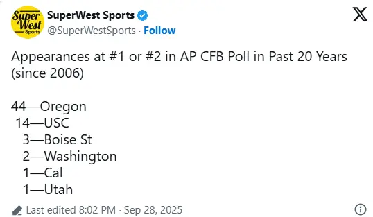 Below is from another site, and gives us pause. Have we been fooled by Hoosier success, or is the 'Cig' that good of a coach to outperform? For those worried about Indiana snapping the nation's longest home winning streak, here are a couple of stats for you: The collective record of the teams Indiana has beaten in the last two years is 45-63. Of their ten wins against FBS teams in the last two seasons, only 3 have come against teams that finished the regular season last year with a winning record or currently have a winning record this year. Those include 7-5 Michigan and 3-2 Iowa. Indiana's talent composite this year is No. 72 in the country. Thats lower than Ok State and Oregon State. Obviously they are echelons better than those teams, but still. Dan Lanning has lost 6 games in 4 years. Those losses came against the No. 3, No. 25 (x2), No. 2, No. 20 and No. 54 teams in talent composite. The one outlier there is 2022 Oregon State. (Three years ago...) Against teams not in the top 25 of talent composite Dan is 32-1. Not saying Indiana can’t win or that they aren’t a good team, but if they do win, it would be bucking every single trend we’ve seen in Dan Lanning and Curt Cignettis tenures. Sucking that lemon is sour? Wait until you get to Autzen...