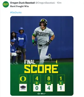 Ducks win 4-0 as Oregon's pitching depth was the difference. Once their ace left--we could go to work on offense. Gabe Miranda bunted down the 3rd baseline, and caught them sitting back to then beat the throw to first. Ryan Cooney hit a high infield bouncer that slowed down to allow him to get on base safely. Jax Gimenez sees everybody coming in close to defend the bunt, and hits if over the right fielder's glove and rolls to the wall. Miranda scores from second, and Cooney went from first to third. Such fast base-runners this year! The relief pitcher for Santa Barbara slipped as he was pitching, and it was called a balk...thus Cooney is scored, and Gimenez moves to third. Drew Smith is intentionally walked. Then the Ducks sucked the infielders into a pickle with Smith...while Gimenez scores before the out to get the fourth run! Devin Bell finished it off with his curve drop-bal,l and a 97 mph heater to mess up the batters. Even with that...Maddox Molony was backing up the 3rd baseman on a hit through the infield, and snagged the grounder, turned his body and made the long throw in time for the out! Hitting, pitching and fielding. Be proud of this team!