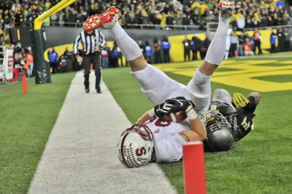 He missed TWO bunny field goals, and one hit the upright. Choker. FishDuck Photographer Kevin Cline caught this perfect picture showing the pass was NOT good. And who can forget the run-along-side-but-does-not-block.... So there were actually FOUR blunders that went against Oregon. And thanks, for bringing up the memory! Doesn't bother me at all...