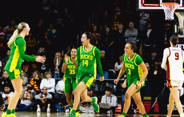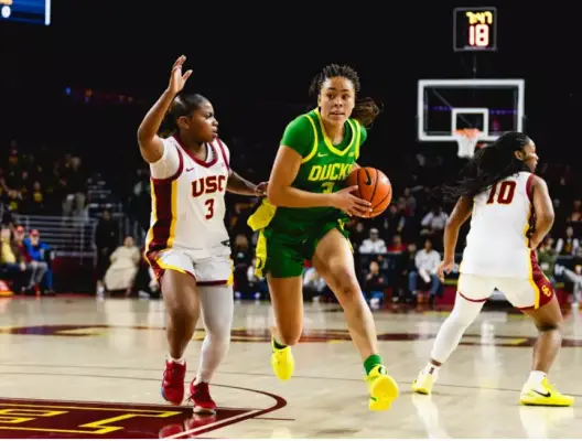 4. OREGON ATHLETIC COMMUNICATIONS FOR IMMEDIATE RELEASE | JANUARY 6, 2026 WOMEN’S BASKETBALL | @OregonWBB Frantic Finish Gives Ducks Win at No. 21 USC LOS ANGELES – Spurred on by the greatest player in program history, Oregon mounted one of its greatest comebacks in recent memory. After trailing by 17 at one point, the UO women's basketball team rallied back and upset No. 21 USC at the Galen Center on Tuesday, 71-66. The Ducks (14-3, 2-2 Big Ten) finished the game on a 14-0 run, taking the lead at 69-66 on the last of three straight three-pointers by junior guard Ari Long. Former star Sabrina Ionescu was sitting courtside with her husband, UO athletics Hall of Famer Hroniss Grasu. Ionescu addressed the Ducks at halftime when they were down 37-21, head coach Kelly Graves said. "We were a little intimidated; she talked about that, talked about just playing stronger," Graves said. "… The message was right on point. And they listened. Maybe I gotta hire her." Ehis Etute had a career-high 17 points with 13 rebounds to lead the Ducks, who outscored the Trojans by 21 points during her 29 minutes of action. Katie Fiso added 14 points with eight rebounds and six assists, while Mia Jacobs and Ari Long each hit a trio of three-pointers and scored 11 points. Long had two points through the first 37 minutes of action, but hit consecutive three-pointers with less than three minutes to play that tied it at 66-66, then the go-ahead three with 31 seconds left. "There's too many heroes to point out," Graves said. "I thought Katie was more like herself in that second half (after scoring two points in the first). But she didn't get down on herself at halftime; she came back out with a new commitment to just do better. And how about the threes from Ari Long? Holy criminy. And then Ehis was spectacular tonight." The Ducks outscored USC in the fourth quarter, 26-8. The Trojans missed their first eight shots of the period, which Oregon opened on a 12-0 run, and USC missed its last seven attempts of the game as the Ducks closed with another run, of 14-0. USC star Jazzy Davidson had 10 points on 4-of-11 shooting in the first half, but she was just 1-of-9 in the second as Oregon's Sofia Bell took the lead on her defensively. "We scored 50 points in that second half, but I think it was our defense that won the game," Graves said. "Late in the game we got stops, and then, most importantly, we got rebounds. … It was just a great win." How It Happened: After leading for much of the first quarter, the Ducks allowed a 16-0 run to end that period and then fell behind by as much as 17 late in the second quarter. They rallied within as little as eight late in the third, but ultimately entered the final period down 58-45. Fiso was the spark plug during the 12-0 run to open the fourth, hitting three buckets during that stretch. Etute and Sarah Rambus both scored in the post, and Etute capped the run with two free throws to make it 58-57 with 6:16 left. A quick 8-0 run over the next 90 seconds got USC back out in front 66-57. But those would end up being the only points of the final quarter for the Women of Troy. Etute hit another layin with 4:31 to go, kicking off Oregon's frantic finish. After her free throw made it 66-60 with 3:37 to go, Long hit consecutive three-pointers and suddenly the score was tied, 66-66. The teams then traded misses, with Jacobs blocking a shot for the Ducks. Then, each team had a turnover. Jacobs had a chance for a go-ahead three with 37 seconds and missed, but Etute secured the rebound and Oregon called timeout. Coming out of the huddle, Long ran to a corner mere feet from where Ionescu and Grasu were sitting, and made the three that gave the Ducks their first lead since it was 9-7. "Normally, she would curl that, but we told her, run straight to the three and she did it," Graves said. "And you know what, that's not an easy shot." At the other end, USC missed and the rebound was secured by none other than Long. Fiso then made two free throws with 17 seconds left, and the Ducks had secured the come-from-behind victory. "We seem to just play better when we're behind, and we play with a little desperation," Graves said. "But man, I could not be more proud of our team." Oregon's early 9-7 lead was forged by buckets from Etute, Fiso and Jacobs, and then a three-pointer from Jacobs with 3:26 left in the period. But USC scored 16 straight to lead 23-9 entering the second. Baskets from Etute and Long followed by a three-pointer from Astera Tuhina gave Oregon a 7-2 run to open the second, cutting the deficit to single digits at 25-16. The Trojans answered with a 10-2 run for their biggest lead of the night, 35-18, and had a 37-21 advantage when Ionescu raised her voice in Oregon's halftime locker room huddle. The UO deficit was 15 early in the third at 43-28 when the Ducks mounted a 9-3 run to get back within single digits at 46-37. Etute had four points and Avary Cain scored three during that spurt, and moments later Bell hit a three to get the deficit back to nine at 51-42. After two USC free throws, Jacobs made another three and the deficit was eight, 53-45, before the Trojans rallied back into a 13-point lead entering what would end up being an unforgettable fourth quarter for the Ducks. Up Next: The Ducks host Michigan State on Sunday (2 p.m., B1G+).