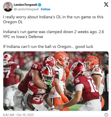 Oregon 34-21 1 TO 3 Sacks 275 yds passing The right side of Indiana's O-line has some issues. Matayo, Tatum and the edges will pressure Mendoza and get home at least twice IF the Ducks put IU in a position where they have to pass because the run D makes the RPO less effective.