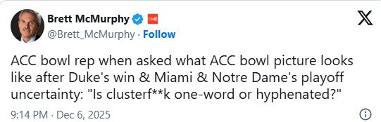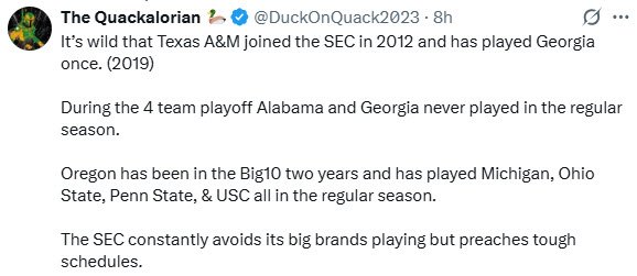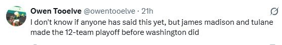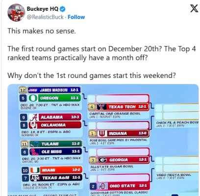 Great comment, JS. They're afraid of playing Ohio State OOC instead of Ohio Wesleyan. And why not? The nation's No. 1 team played donut holes OOC. A 24-team PO will include two G6 teams. Including Tulane and JMU in the 12-team field is because of a screwed up ACC, lawyers, and politicians. Notre Dame, Texas, Vanderbilt, and yes, USC, would have a chance to win it all? Tulane and JMU?