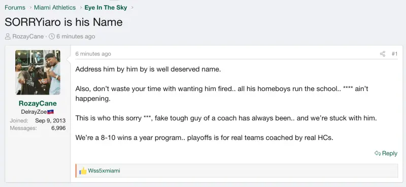 8 hours ago8 hr No. 34 minutes ago, DrJacksPlaidPants said:How long does Mario last in Miami? I know the fans are going to be calling for his head.Honestly, when I'm reading their fan forums, I think they want Mario to take his head with him. They don't know want any part of his coaching decisions to stay around. 😂😂😂